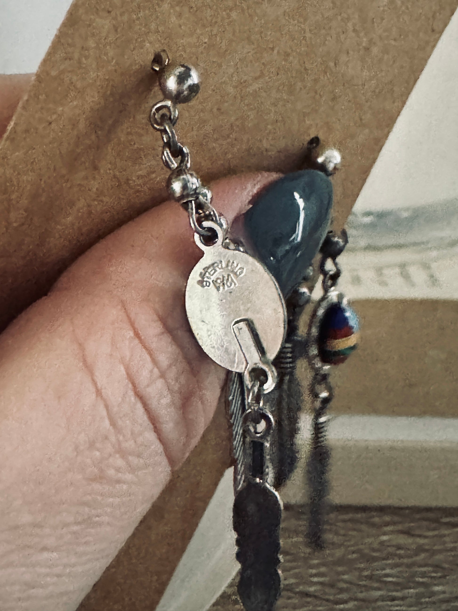 Signed WM. Malachite, turquoise, coral, lapis and agate inlay! These dangle 2.25” long